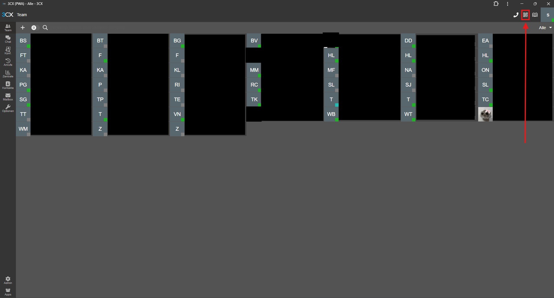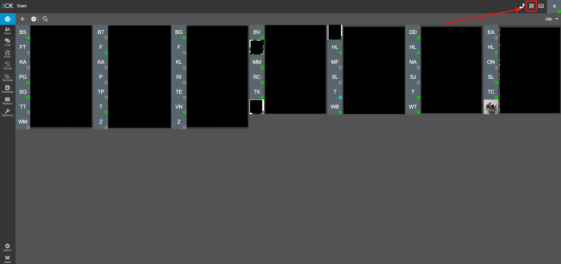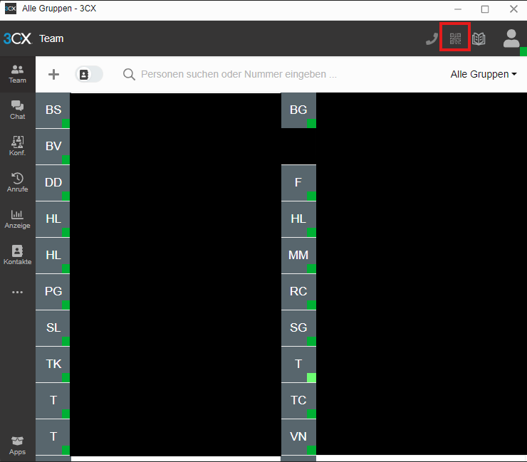 Bitte wählen Sie oben rechts das QR-Codelogo aus und scannen den QR-Code mittels der 3CX-App ein.