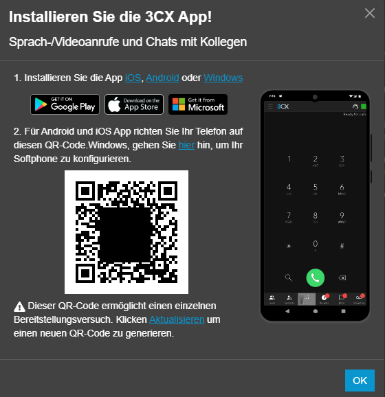 In Falle, dass Sie bereits bei einer 3CX Desktop App angemeldet sind, können Sie ebenfalls den QR-Code darüber abfragen: