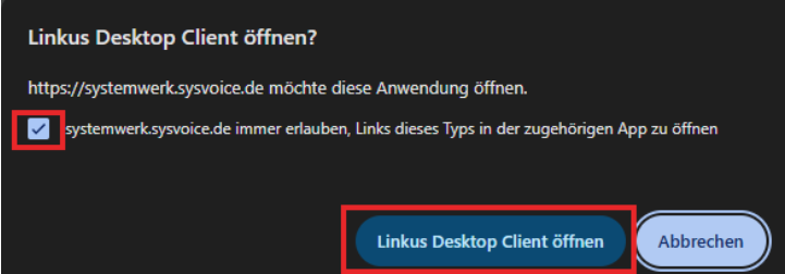 Anschließend werden Sie gefragt, ob Sie den Desktop-Client öffnen möchten. Hier wählen Sie bitte „immer erlauben“ sowie „Linkus Desktop-Client öffnen“ aus.