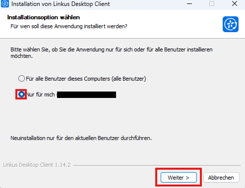 Hier wählen Sie bitte (wie rot markiert) „Nur für mich“ und anschließend Weiter.