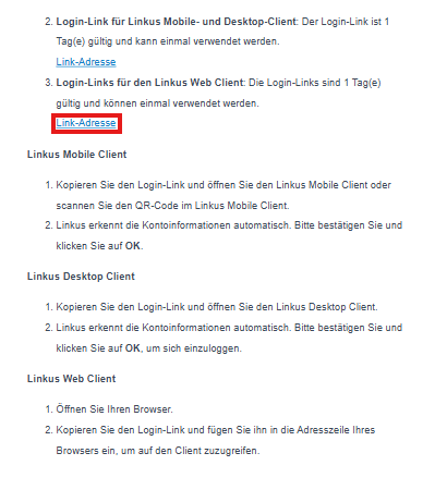 Nach Erhalt der hier gezeigten Willkommens-E-Mail wählen Sie bitte bei Punkt drei, wie rot umrandet "Link-Adresse" aus.