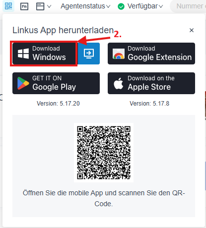 Um den Linkus Desktop-Client zu installieren (PC), können Sie einfach auf das blaue QR-Code-Symbol oben rechts klicken.